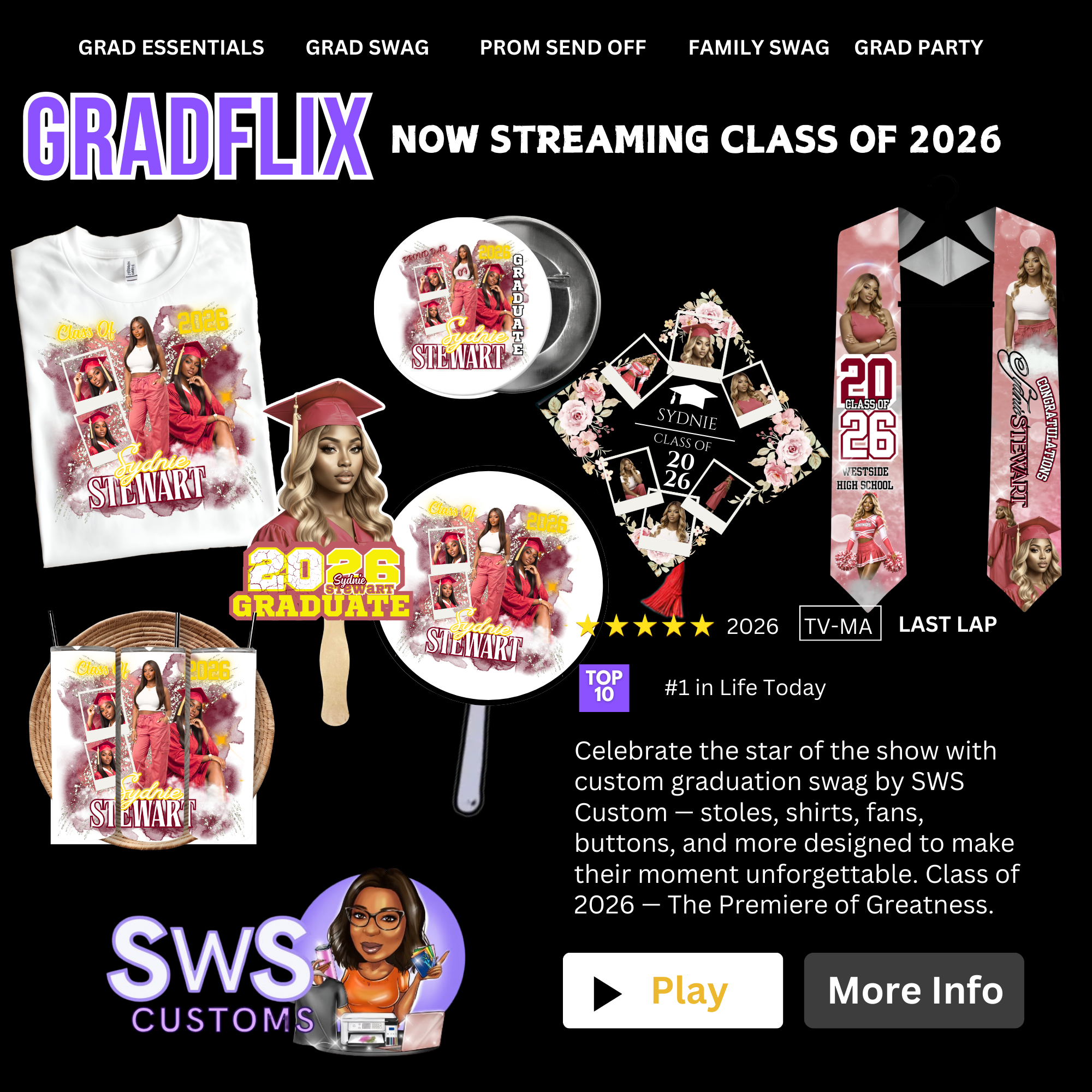 Make your grad celebration special by choosing from our 2025 collection. Custom requests available - let SWS deliver an unforgettable experience.